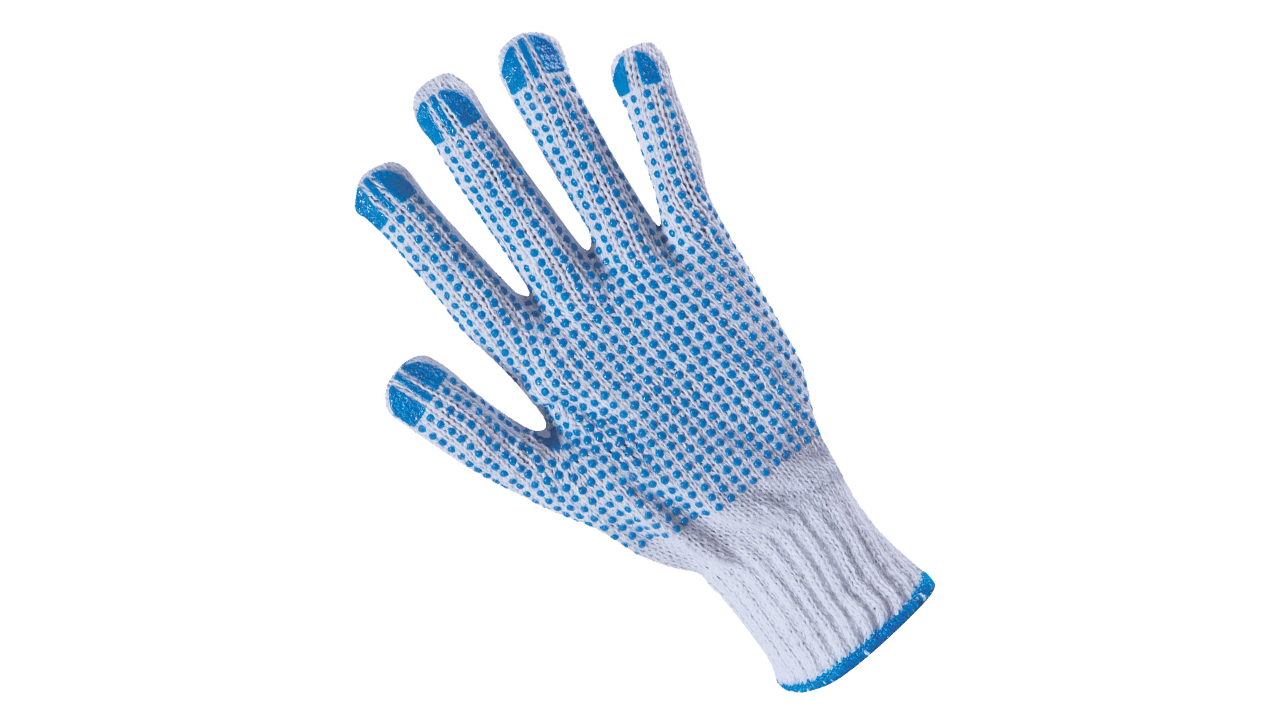 Luvas de trab. s/costuras em algodão/poliéster c/círculos em PVC br. e az.