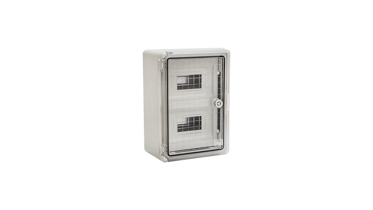 Quadros fornecidos com porta transparente com abertura de 90º. Fabricados com plástico auto-extinguível resistente a altas temperaturas. Equipados com calha DIN, barramento de neutro e barramento de terra.